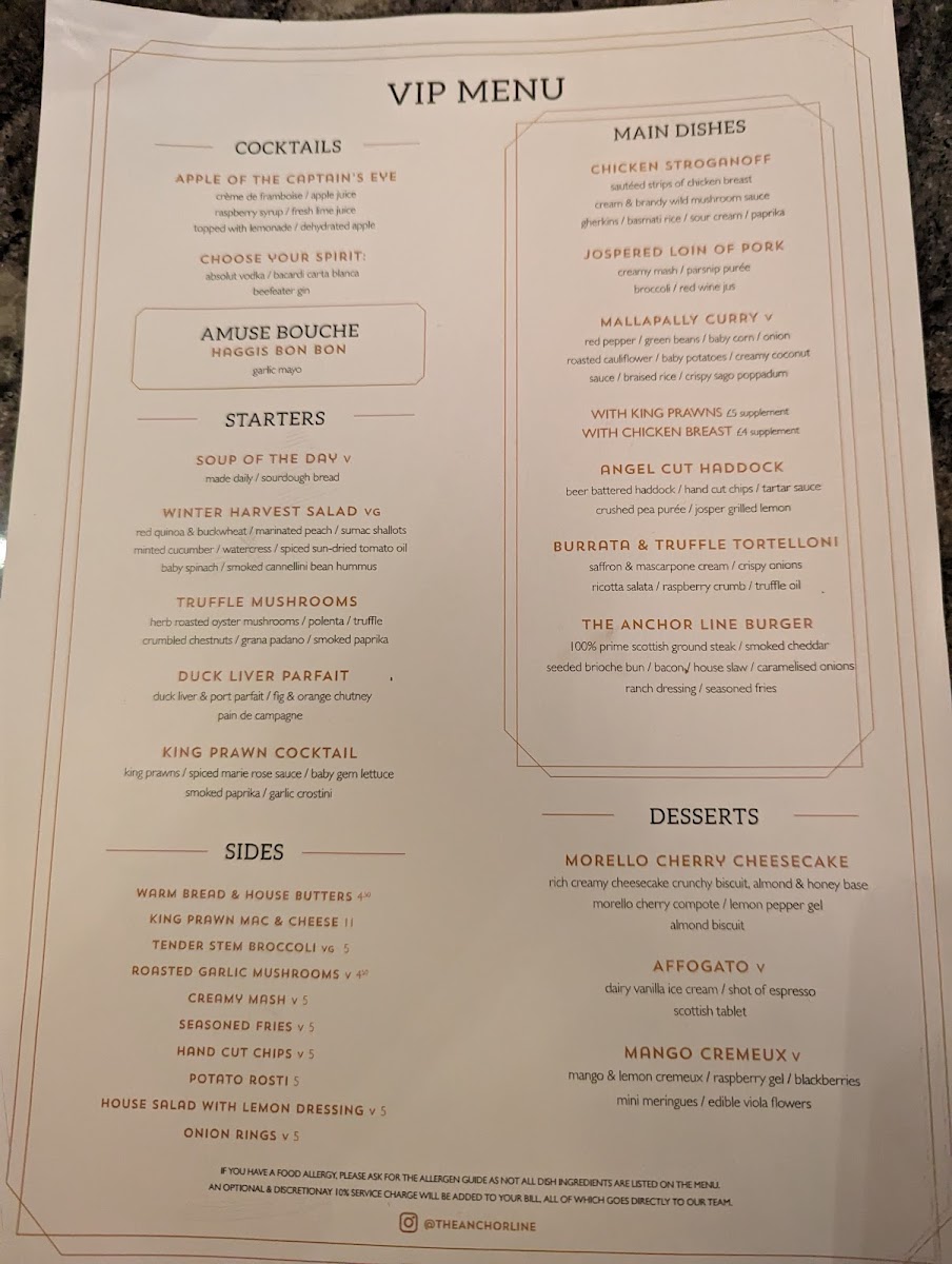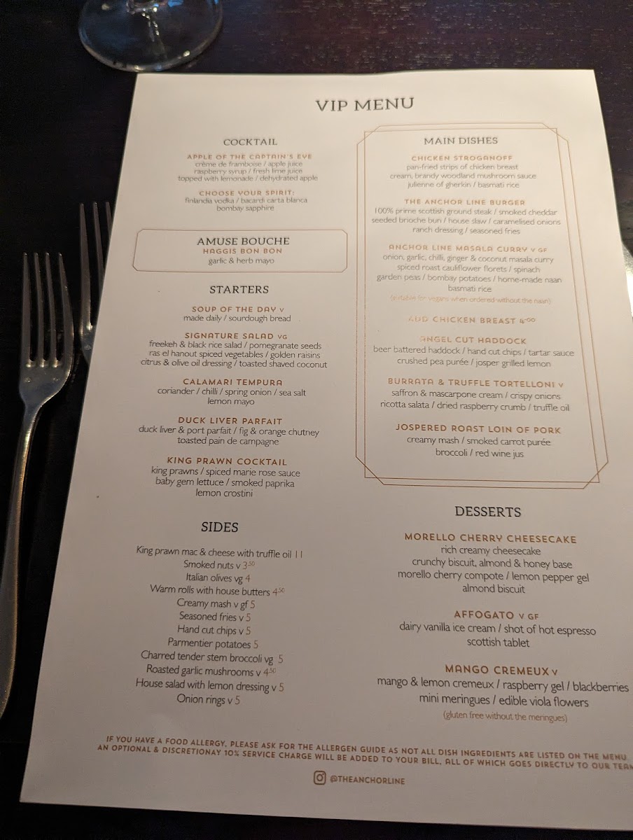 In conclusion, The Anchor Line provides a fantastic dining experience with its diverse menu, excellent service, and inviting atmosphere, making it an excellent choice for anyone in Glasgow looking to enjoy a memorable meal.